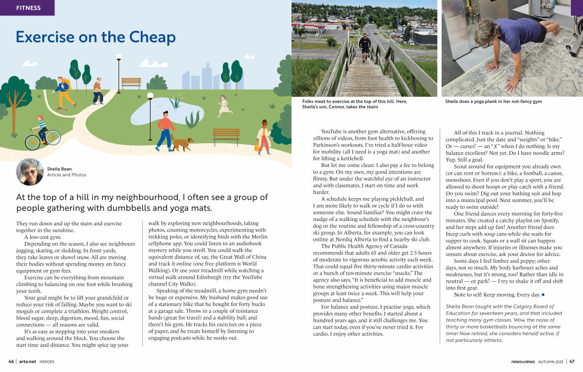 Sheila Bean taught with the Calgary Board of Education for seventeen years, and that included teaching many gym classes. Wow, the noise of thirty or more basketballs bouncing at the same time! Now retired, she considers herself active, if not particularly athletic.