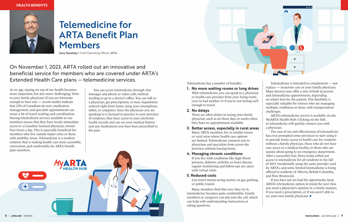 As we age, staying on top of our health becomes more important, but also more challenging. Visits to your family physician( if you are fortunate enough to have one— recent studies indicate that 22 % of Canadians do not), medication management, and specialist appointments can mean a lot of travel, waiting, and coordination. Having telemedicine services available to our members means that they have nearly immediate access to a Canadian licensed physician, twentyfour hours a day. This is especially beneficial for members who live outside major cities or those with mobility issues. Telemedicine is a modern solution that is making health care more accessible, convenient, and comfortable for ARTA benefit plan members.