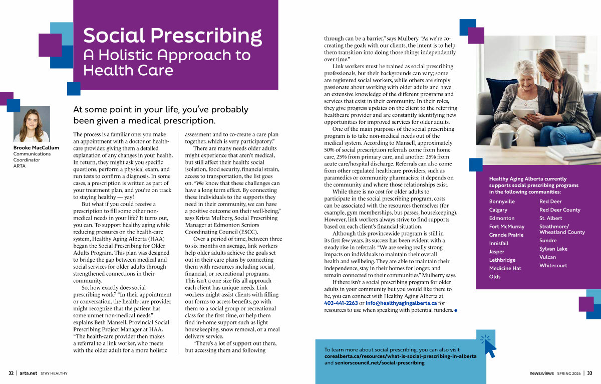 But what if you could receive a prescription to fill some other nonmedical needs in your life? It turns out, you can. To support healthy aging while reducing pressures on the health-care system, Healthy Aging Alberta( HAA) began the Social Prescribing for Older Adults Program. This plan was designed to bridge the gap between medical and social services for older adults through strengthened connections in their community.