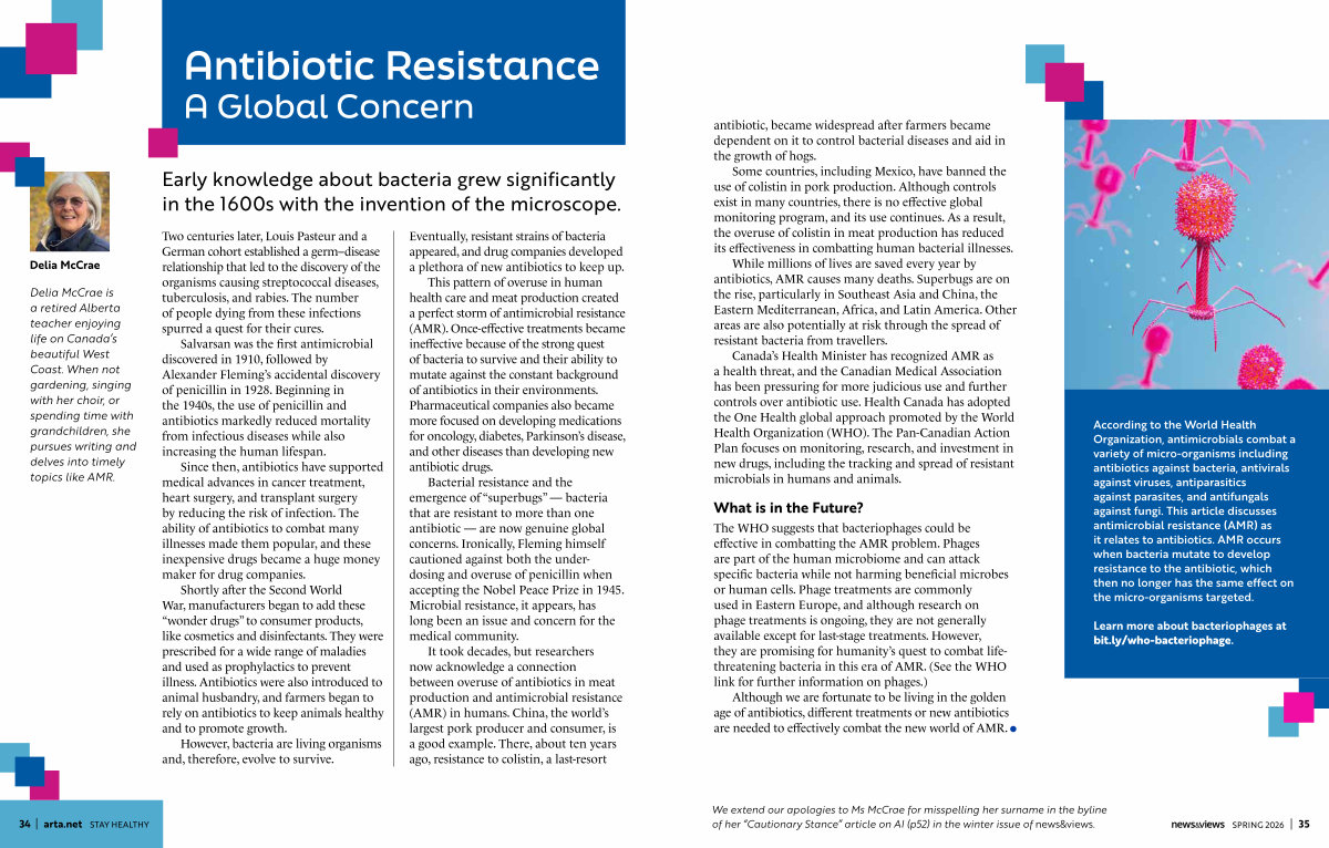Delia McCrae is a retired Alberta teacher enjoying life on Canada’ s beautiful West Coast. When not gardening, singing with her choir, or spending time with grandchildren, she pursues writing and delves into timely topics like AMR.