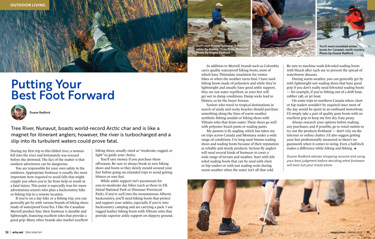 You are responsible for your own safety in the outdoors. Appropriate footwear is usually the most important item required to avoid falls that might cripple you when you’ re far from help or result in a fatal injury. This point is especially true for more adventurous seniors who plan a backcountry hike or fishing trip to a remote location.