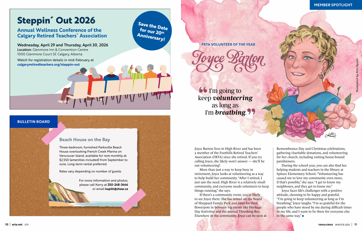 Joyce Barton lives in High River and has been a member of the Foothills Retired Teachers’ Association( FRTA) since she retired. If you try calling Joyce, she likely won’ t answer— she’ ll be out volunteering!