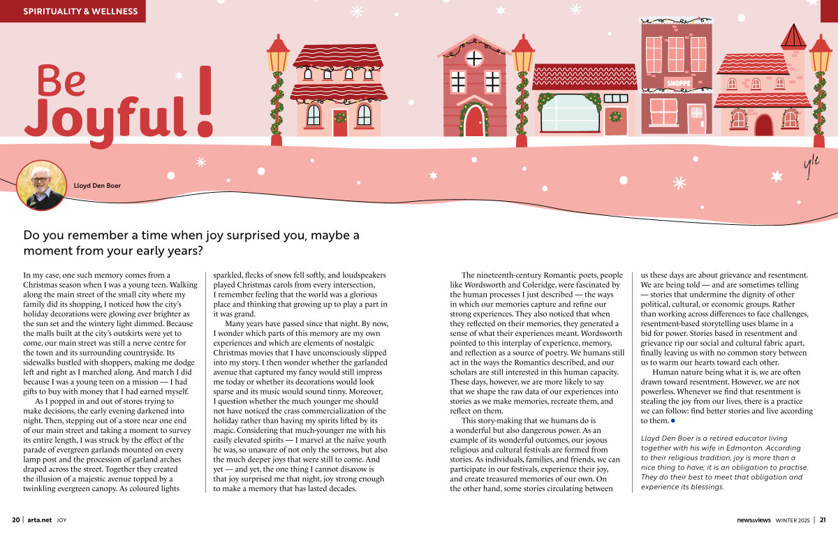 In my case, one such memory comes from a Christmas season when I was a young teen. Walking along the main street of the small city where my family did its shopping, I noticed how the city’ s holiday decorations were glowing ever brighter as the sun set and the wintery light dimmed. Because the malls built at the city’ s outskirts were yet to come, our main street was still a nerve centre for the town and its surrounding countryside. Its sidewalks bustled with shoppers, making me dodge left and right as I marched along. And march I did because I was a young teen on a mission— I had gifts to buy with money that I had earned myself. As I popped in and out of stores trying to make decisions, the early evening darkened into night. Then, stepping out of a store near one end of our main street and taking a moment to survey its entire length, I was struck by the effect of the parade of evergreen garlands mounted on every lamp post and the procession of garland arches draped across the street. Together they created the illusion of a majestic avenue topped by a twinkling evergreen canopy. As coloured lights