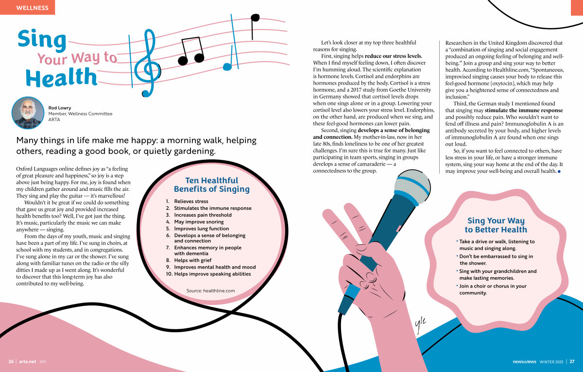 From the days of my youth, music and singing have been a part of my life. I’ ve sung in choirs, at school with my students, and in congregations. I’ ve sung alone in my car or the shower. I’ ve sung along with familiar tunes on the radio or the silly ditties I made up as I went along. It’ s wonderful to discover that this long-term joy has also contributed to my well-being.