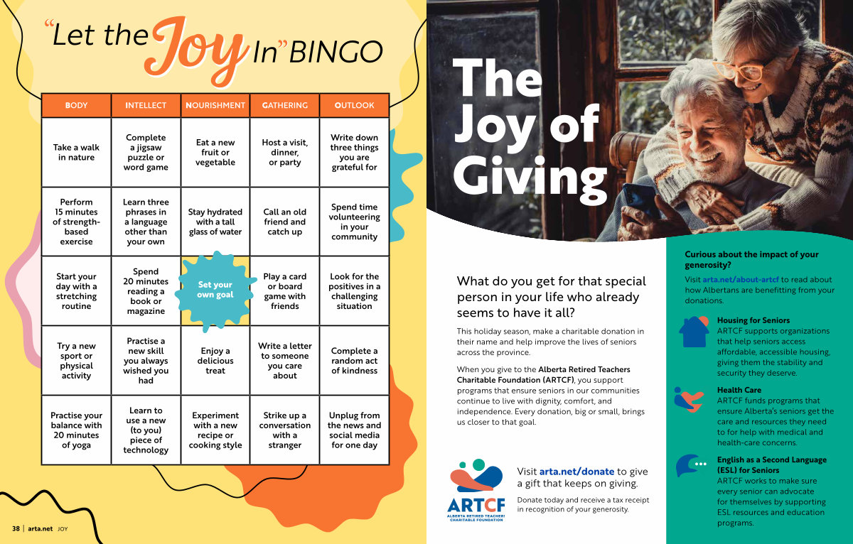When you give to the Alberta Retired Teachers Charitable Foundation( ARTCF), you support programs that ensure seniors in our communities continue to live with dignity, comfort, and independence. Every donation, big or small, brings us closer to that goal.