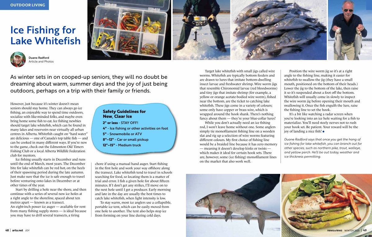 However, just because it’ s winter doesn’ t mean seniors should stay home. They can always go ice fishing, an enjoyable way to spend time outdoors, socialize with like-minded folks, and maybe even bring home some fish to eat. Ice fishing newbies should target lake whitefish, which can be found in many lakes and reservoirs near virtually all urban centres in Alberta. Whitefish caught on“ hard water” are delicious— one of Canada’ s top table fish— and can be cooked in many different ways. If you’ re new to the game, check out the Edmonton Old Timers Fishing Club or a local Alberta Wildlife Federation club for mentors.