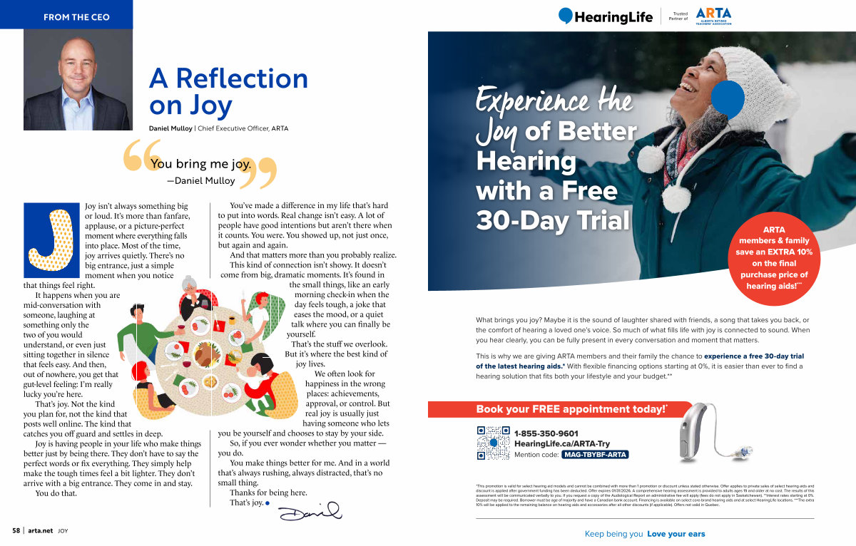 This is why we are giving ARTA members and their family the chance to experience a free 30-day trial of the latest hearing aids.* With flexible financing options starting at 0 %, it is easier than ever to find a hearing solution that fits both your lifestyle and your budget.**